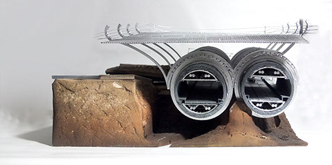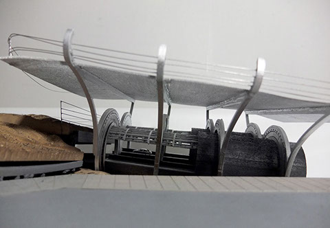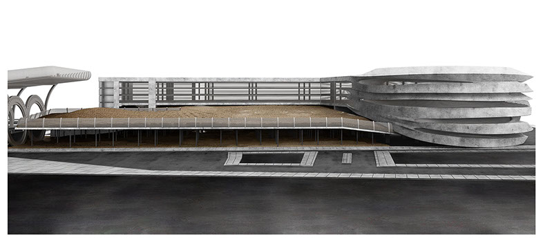 The other element along the site that links back to the infrastructure is the ventilation systems, which were moved from the tunnel to the existing parking, and redesigned to serve as the main catalyst for people to circulate throughout the project. This was exhibited in the main entrances (both vehicular and pedestrian) to the parking structure, and revealed along the newly exposed tunnel system. For the pedestrian access, the ventilation spirals itself along the platforms, stair, and pathways in the interior. As for the vehicular access, the ventilation would change shape to better fit the double helical ramps that serve as the parking entrance. The ventilation system wraps around the roads and into the park and parking structure, and spirals into the ground.