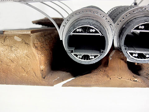 The landscape of the park was created through the excavation of the soil surrounding the tunnels and the subsequent relocation around the rest of the site. In each location, the soil takes on a different identity. Where the soil was removed, the area was left as is, exposing the multiple soil strata and bedrock. Under the plinth the soil is left loose to create hills and ditches as it was dumped in. After the intervention of the new soil, retaining walls were imposed around the roads to keep the soil from interrupting the vehicular traffic. Above the plinth, the soil retains the marks of the truck used to relocate the soil. Since different trucks would be used to move the soil around, due to limitations in the existing infrastructure, different patterns and textures can be seen throughout the plinth.