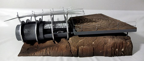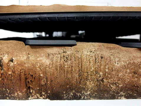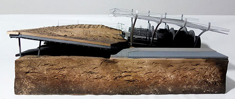 Park Sections Ventilation Hole The ventilation digs into the soil creating a cork screw into the ground Plinth Soil The light soil that was placed on top of the plinth retained the texture of the truck used to place it. This soil has two texture, one on the outside and one on the inside based on the different machine used to place and level it due to the interior ceiling heights of the parking garage Plinth Split The plinth is split from where the plinth meets the ground on to the level of the plinth Excavation Zone The zone under the tunnels has been excavated to reveal the true nature of the soil. The bed rock, as well as multiple different soil stratas are exposed are visible Rebar The rebar coming in from the surrounding site and original structure are left exposed as a texture and detail with in the underground of the soil
