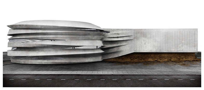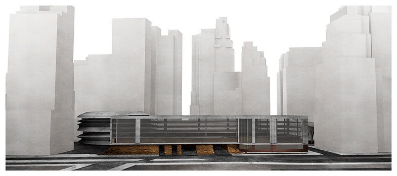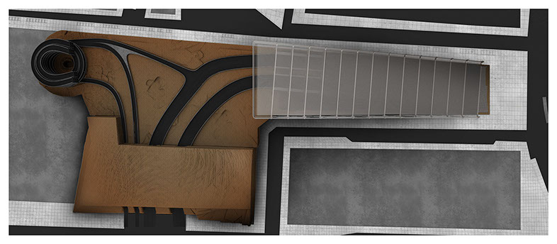 Battery Tunnel Park is located in South Manhattan where the tunnel comes out into the city. It covers the tunnel entrance and exit, and enters into the existing parking lot. The intention behind the project is to extract elements linking the existing infrastructure to a new public park. The park and infrastructure work together to create a new spatial sequence that compels the public to circulate through both sections. To achieve this, the park begins by raising a portion of the lot over the roads that connect to the Battery Tunnel. This allows for a maximum amount of the space be returned to the public and separates the vehicular traffic from the pedestrian traffic that inhabit the park. The infrastructural and structural elements are combined to create the new landscape through the excavation of the site underneath the tunnels. The varying strata of soil that exist in the site were displaced and relocated to infill the existing parking structure. This allows the opportunity to selectively conceal and expose elements of the infrastructure. The main infrastructural element which was revealed is the Battery Tunnel, which was extended to connect to the new landscape. This soil removed, was then used to infill the plinth structure over the roads, and the bottom half of the existing parking structure. This establishes a strong visual connection between the existing structures and the natural elements within the site. To reinforce the idea of using soil as an architectural material it was treated, so it would reflect the design process along each of its stages of displacement.